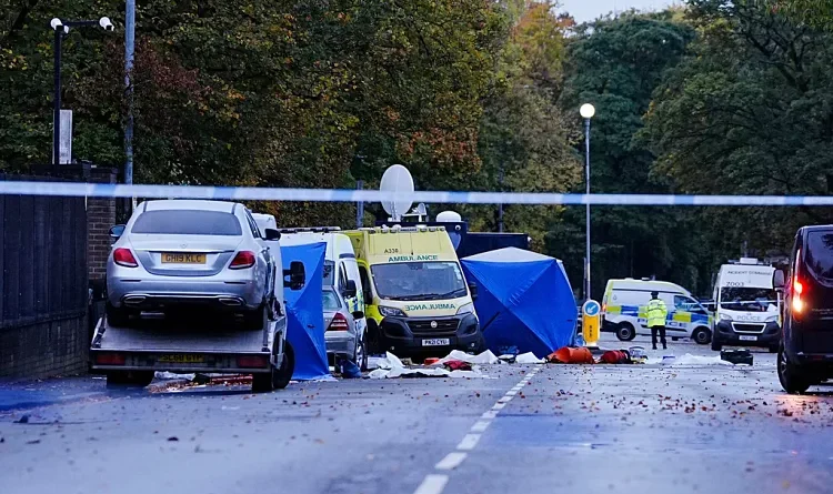 Police investigation continues at the scene near Heaton Park Hebrew Congregation Synagogue in Crumpsall, Manchester, England Friday, Oct. 3, 2025.